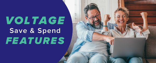 *APY=Annual Percentage Yield. The Voltage Save and Spend dividend provides an Annual Percentage Yield (APY) of 2.00% APY/Dividend Rate of 1.985% for balances of $0.01 - $250,000 and a 0.50% APY/Dividend Rate of 0.50% for balances over $250,000. Payment of dividends requires the account to be set up for eStatements and maintain an Average Daily Balance of $20,000 in the Voltage Save and Spend per statement period. Both qualification criteria are required to be met to earn the stated Dividend Rate and APY. If both qualification criteria are not met no Dividend will be paid. The Voltage Save and Spend dividend rate may change after account is opened and is subject to change at any time. The Daily Balance method is used to calculate dividends on the account. This method applies a daily periodic rate to the principal in the account each day. Dividends begin to accrue on the business day you make a deposit. Dividends are compounded daily and posted monthly on the last day of the month to account that meet qualifications criteria. Please note the minimum opening balance is $2,500. Limit one Voltage Save and Spend Account per membership.