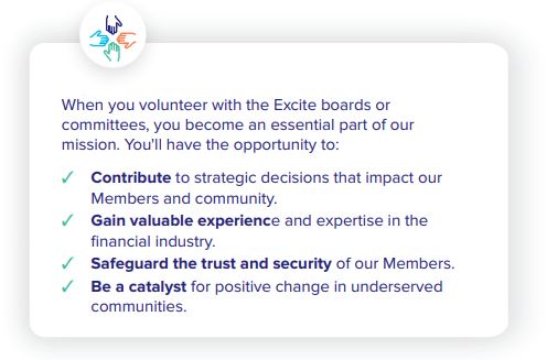 At Excite Credit Union, we’re more than just a financial institution – we’re a community-driven force for positive change. The mission is clear: to make a profound difference in the lives of our Members and the underserved communities we proudly serve. We believe in the power of unity, innovation, and a shared commitment to a brighter future. We are seeking committed Members to join the mission and leverage their related professional expertise as Volunteers furthering Excite’s impact.